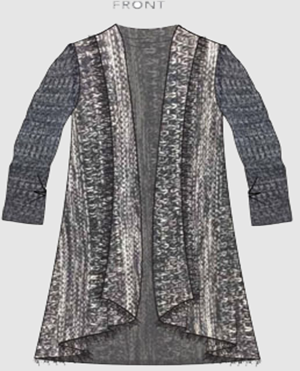 Style: VS 1009 ASYMETRIC HEM LONG CARDIGAN ONE SIZE FITS ALL YARN: 30% WOOL 70% ACRYLIC